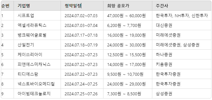 7월에는 총 9개 기업이 공모주 청약을 진행할 예정입니다. 특히 시프트업과 같은 대형 게임 개발 회사부터 시작하여, 의료 및 바이오 기술, 금융 IT 솔루션을 제공하는 기업까지 다양합니다.