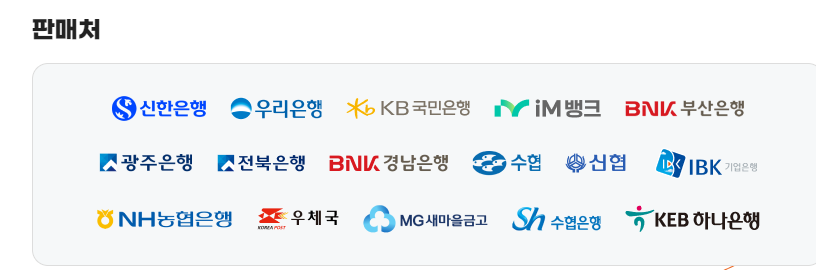 - 농협, 신한은행, 우리은행, 국민은행, IBK기업은행, 새마을금고 등에서 구매 가능