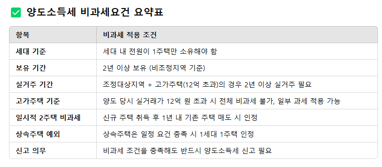 ✅ 양도소득세 비과세요건 요약표