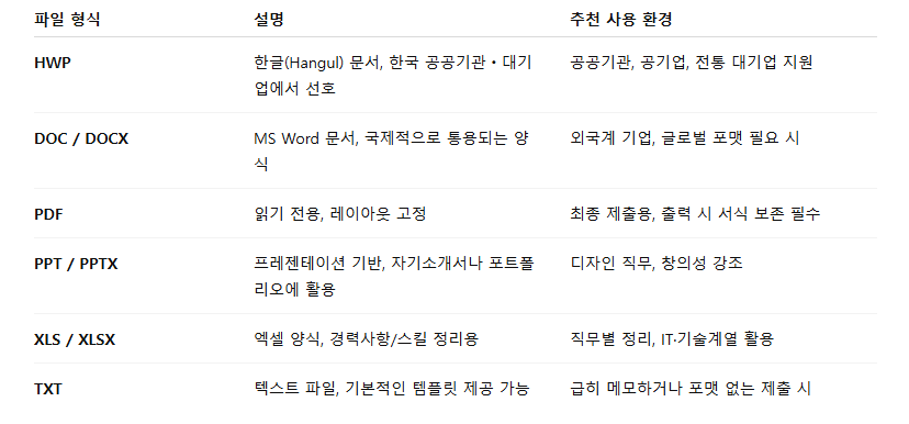 이력서 자기소개서 양식은 HWP 외에도 다양한 형식으로 제공됩니다. 사용 목적이나 작성 환경에 따라 아래와 같은 형식을 선택할 수 있습니다