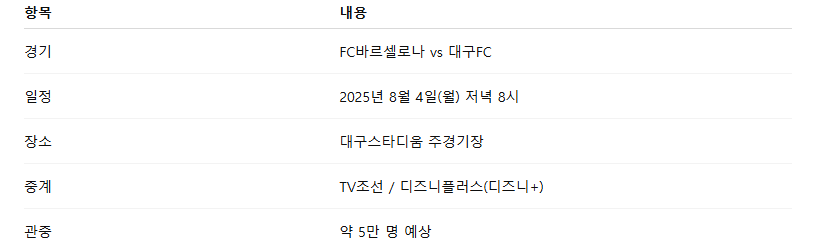 요약: 대구FC 바르셀로나 중계·하이라이트·일정 핵심 정보