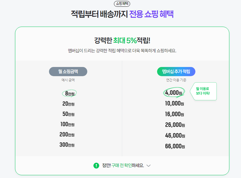 - 특별 적립일: 매월 1회 '멤버십데이'에는 20만 원 이상 구매 시 기본 적립 외에 추가로 3%가 더 적립됩니다. 총 8%의 적립 혜택을 받을 수 있는 날입니다.