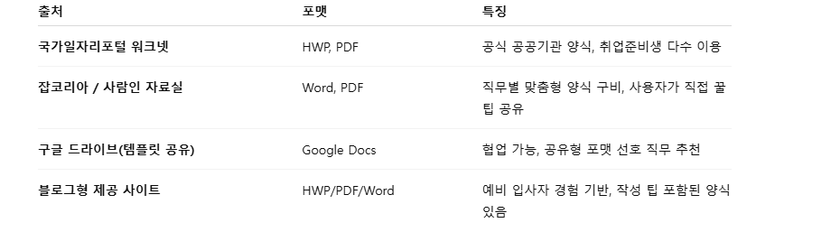 이 네 곳은 이력서 양식 무료 다운로드 시 품질, 편의성, 추천도 모두 높은 플랫폼입니다.