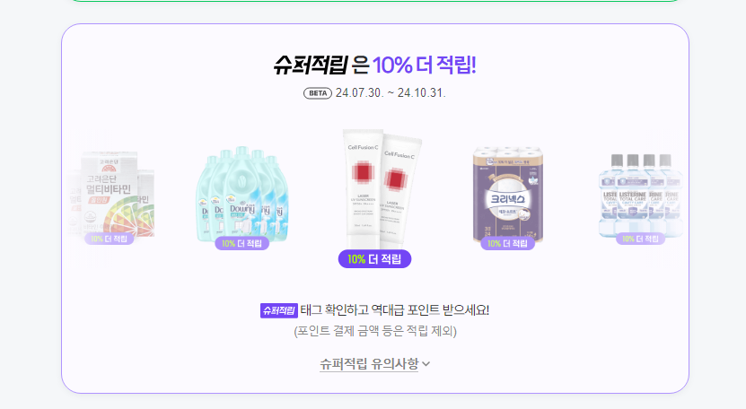 - 슈퍼적립 태그가 붙은 상품을 구매할 경우, 기존 적립 외에 추가로 10%가 더 적립됩니다. 이 혜택은 2024년 10월 31일까지 한시적으로 제공되므로, 적립률을 최대로 높이고 싶다면 이 기간 동안 활용하는 것이 좋습니다.