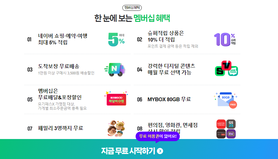 - 네이버 쇼핑: 멤버십 가입자는 네이버 쇼핑에서 제공하는 특별 할인, 배송 혜택 등을 받을 수 있습니다.